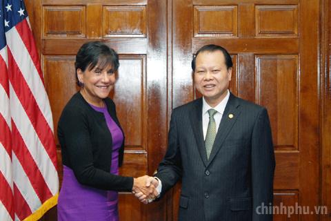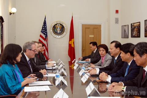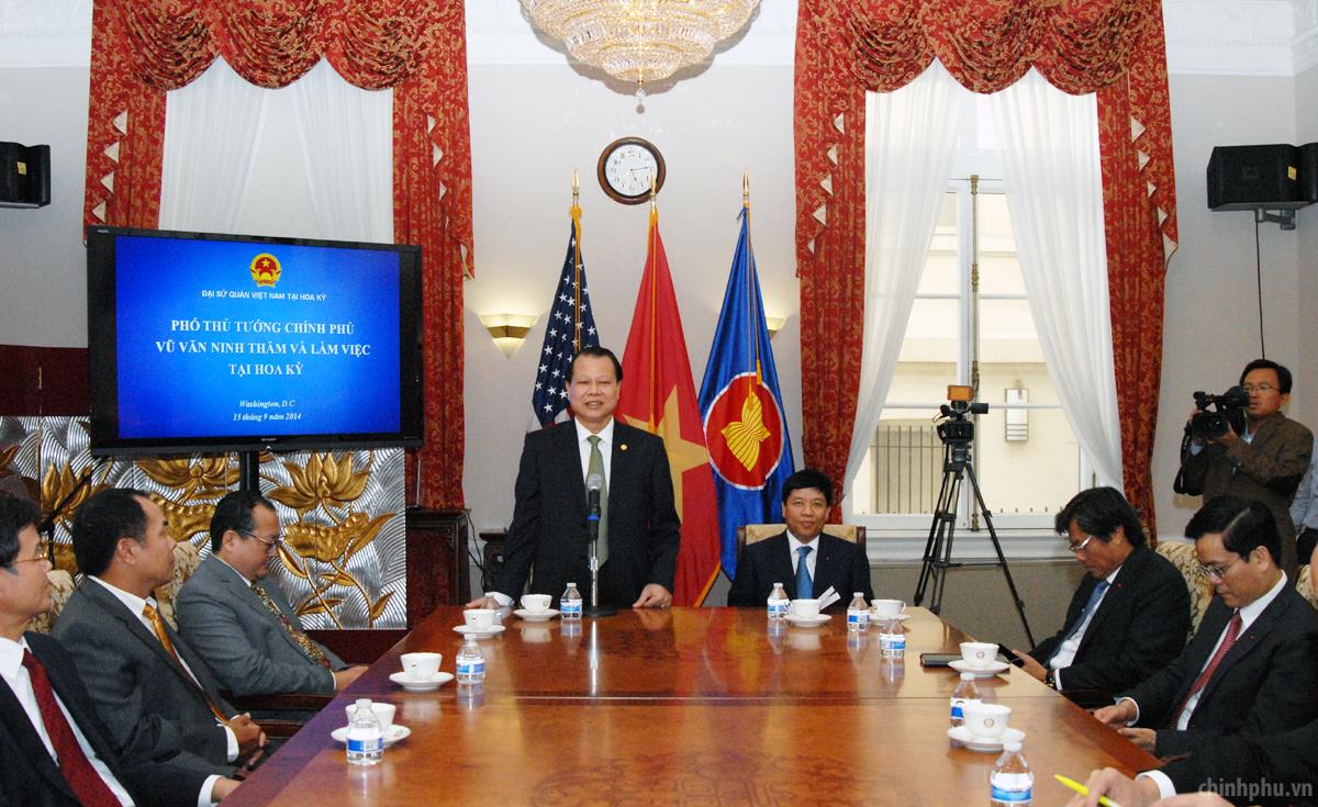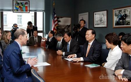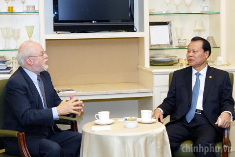 GS Jeffrey ở Viện Peterson, chuyên gia hàng đầu về Hiệp định đối tác xuyên Thái Bình Dương (TPP) của Hoa Kỳ là nhân vật đầu tiên Phó Thủ tướng Vũ Văn Ninh gặp trong chuyến công tác tại Hoa Kỳ. Phó Thủ tướng mong muốn Viện Peterson và GS Jeffrey hỗ trợ Việt Nam nghiên cứu tác động của Hiệp định TPP đối với nền kinh tế Việt Nam. Ảnh: VGP/Thành Chung